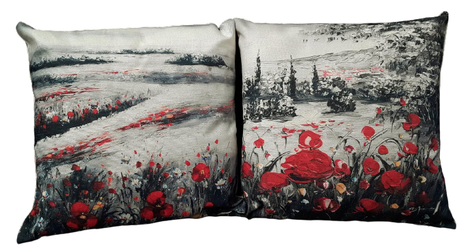 Cushion/Pillow Covers “Moods of Provence” and “Serenity” from two of Grant Young’s Original Palette Knife Oil Paintings. These scenes from Provence have Red Poppies which have significant meaning for Australians in regard to Anzac and Remembrance Day.